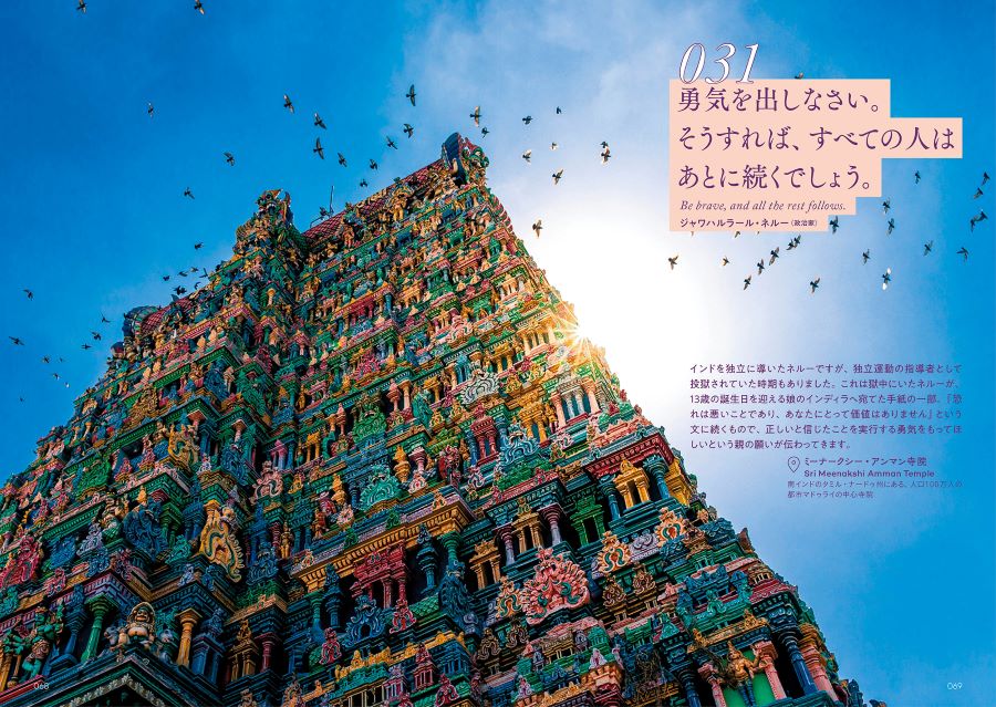 まずはインドから。ヴェーダ(サンスクリット語で知恵の意)の精神が息づくインドの名言と、極彩色の絶景が収録されている。5つのテーマに合わせた名言と絶景写真を、「地球の歩き方」ならではの解説とともに紹介していく。
