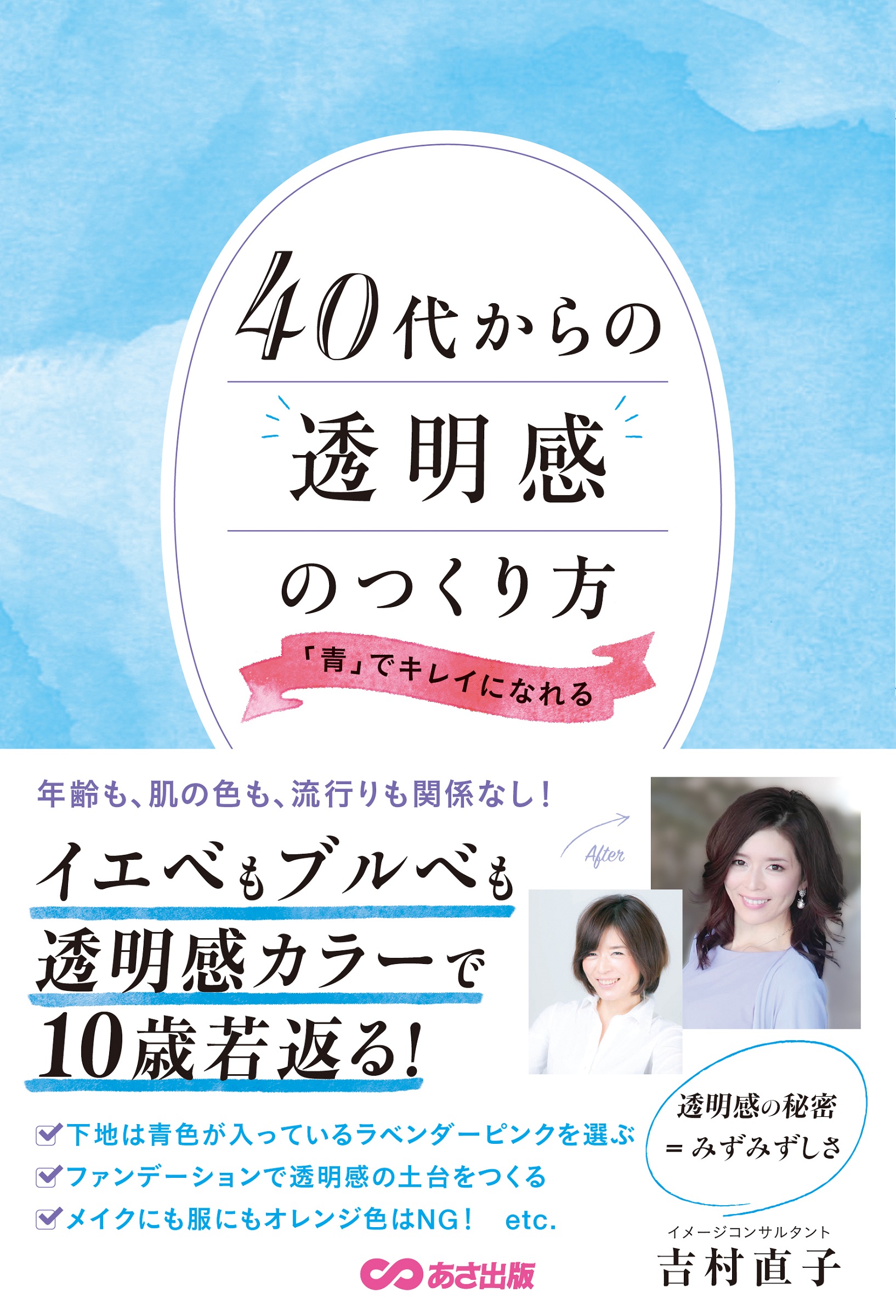 透明感づくりのポイントは「青」。なんと、イエローベース・ブルーベースといったパーソナルカラーとは関係なく、全員に「青」がおすすめなのだそうだ。この透明感メソッドの詳細は、吉村さんの著書『40代からの透明感のつくり方』(あさ出版)で解説されている。