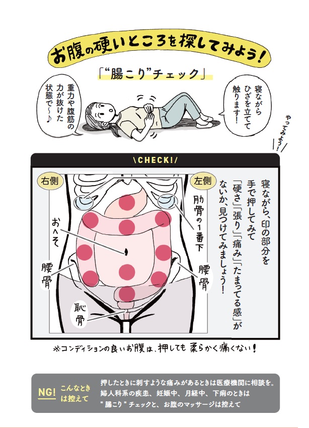 お腹の中の様子がイメージできたら、「腸こりチェック」で、お腹が硬くなっているところがないか探してみよう。硬いところは、自分がほぐすといい箇所なのだという。