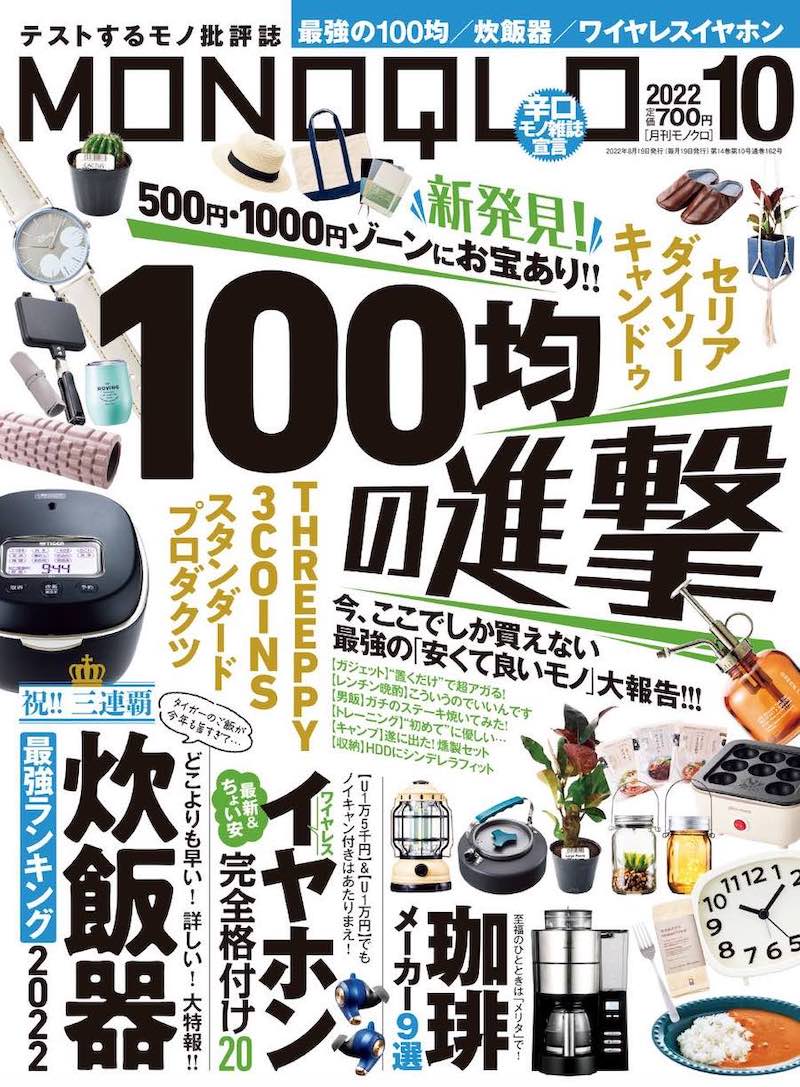 8月19日発売の「MONOQLO」(晋遊舎)2022年10月号では、そんな100均を大特集。「100均の進撃」と題して、ますますレベルアップを続ける セリア・ダイソー・キャンドゥなどの人気ショップを徹底取材している。
