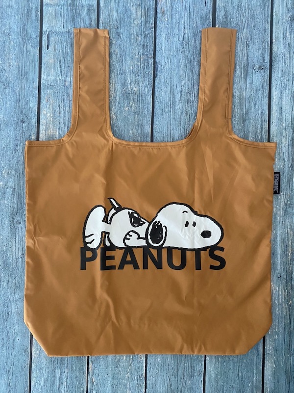 落ち着いたブラウンカラーを基調としたスヌーピーのマイクロエコバッグは、大容量ながら、コンパクトにまとめられるのがポイント。お出かけするとついたくさん買ってしまう私たちの救世主だ。