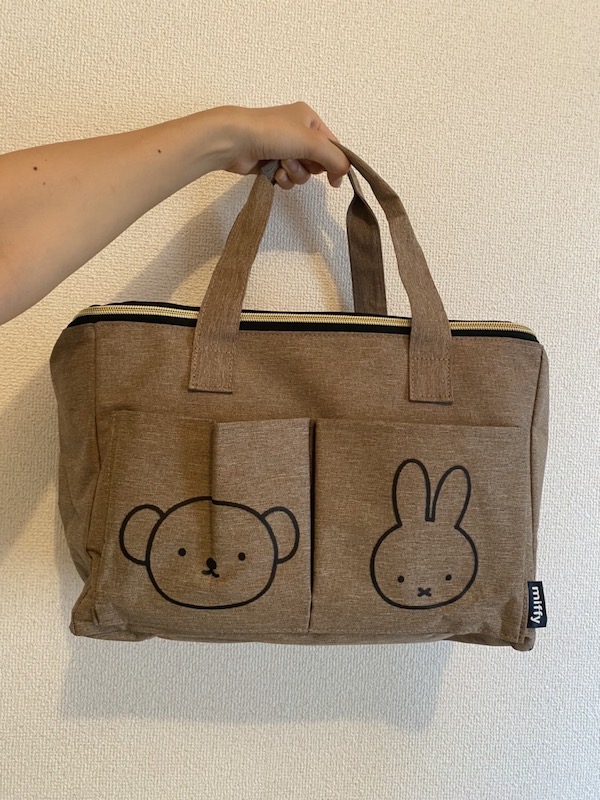 ブラウンを基調とした本アイテムは、ミッフィーとくまの男の子、ボリスのがプリントされた大きめのピクニックバッグだ。