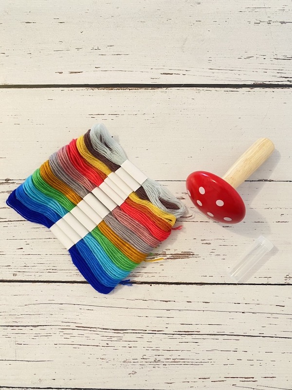 キットの内容は、ダーニングきのこ、針、糸(5m×12色)の3点。キュートな赤いきのこは、布を縫うときに使う裁縫道具です。
