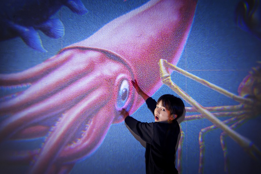 付属シートは学研の図鑑LIVE編集部が制作した「恐竜」「陸と空の動物」「海の生きもの」「人体」に加え、プラネタリウムクリエーター・大平貴之さんの天の川が映る「リアル星空」や、「星座」「妖怪アニメ」「工作」などバリエーション豊か。15cmから5m超までの距離でピントが合い、場所を選ばず使用できる。体がすっぽり入る大きさで映せるので、まるで「ほんものの世界に入りこんだような没入体験」を味える。