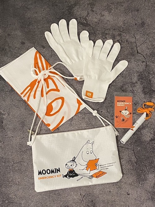 ムーミンとリトルミイがキュートにプリントされたサコッシュ、バンダナ、軍手、ホイッスル&ライト付きペン、防災メモの5点セットです。