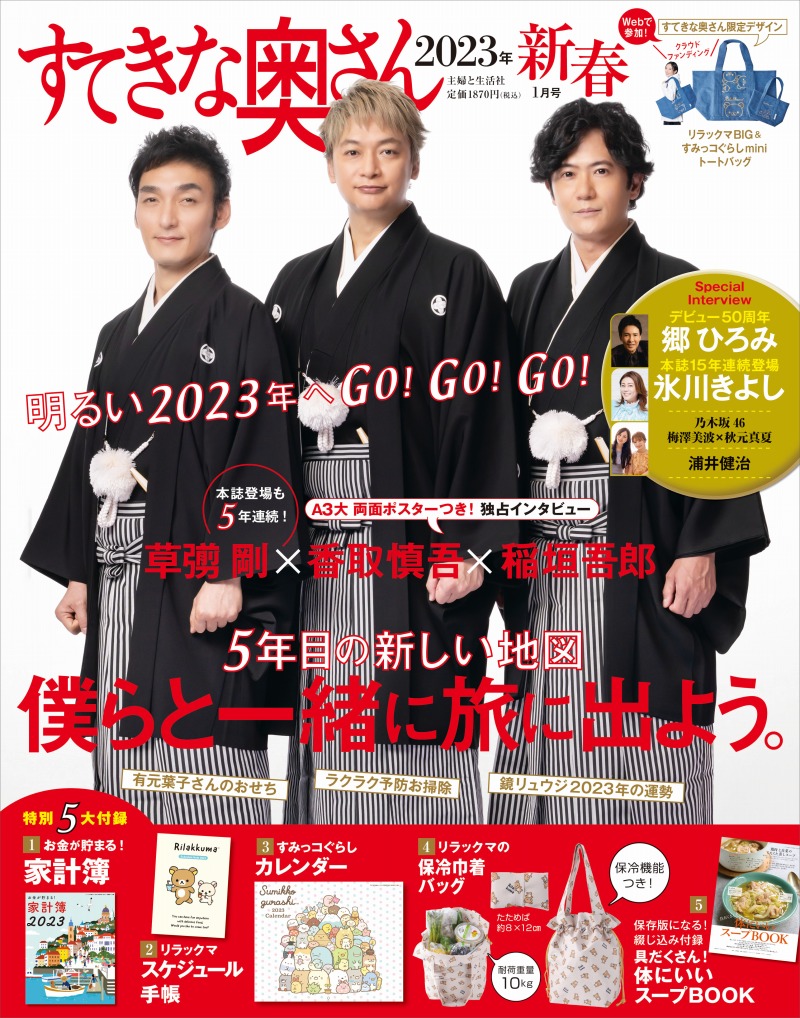 年末年始の女性誌コーナーの顔、「すてきな奥さん」2023年新春1月号(主婦と生活社)が11月18日に発売される。表紙は「新しい地図」の稲垣吾郎さん、草彅剛さん、香取慎吾さん。5年連続で表紙を飾る3人は、黒紋付羽織袴姿で登場している。
