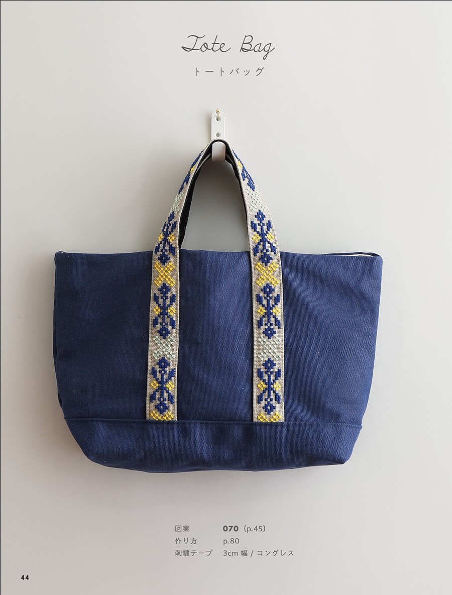 本書では、刺繍テープを活かした作品作りと図案が多数掲載されている。連続模様がメインなので、初心者向けだ。特に、バッグやベルト、ストラップなどの日常使いのアイテムとの相性が良い。