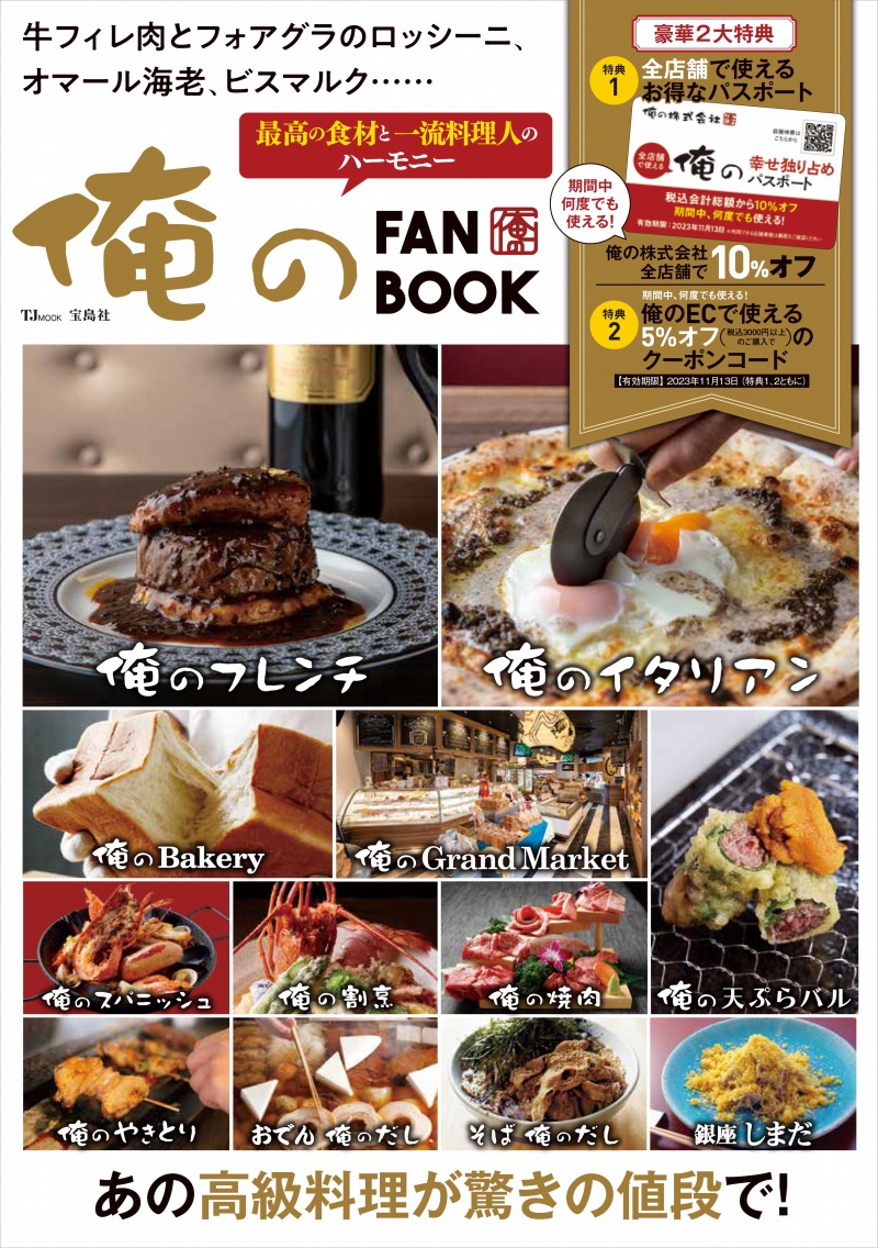 「人気チェーン公式ファンブック」は、宝島社が様々なチェーン店とコラボし、企業の商品や歴史、理念を楽しく伝える人気シリーズ。 最新刊となる本誌は、イタリアンやフレンチ、和食など多数のレストランを展開し、一流料理人が高級食材を調理したメニューをリーズナブルに提供する「俺の株式会社」初のファンブックだ。今回は、全店舗で使える会計から10%オフのパスポートと、ECサイトで使える5%オフ(※)のクーポンコードのお得な2大特典が付録としてついてくる。