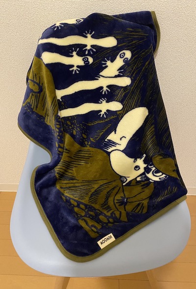 深い青をベースに、ムーミンやスナフキンたちをプリントした落ち着いたデザイン。オフィス用の膝掛けとしても使えます。