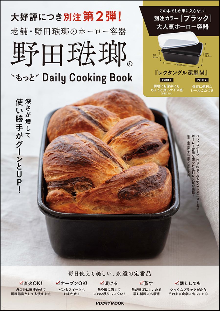 この本のためだけに野田琺瑯が特別生産する別注カラーのホーロー容器がついてくる。カラーは和食器とも洋食器とも相性の良い「ブラック」で、形が深型になっているので使い勝手がさらに良くなっている。