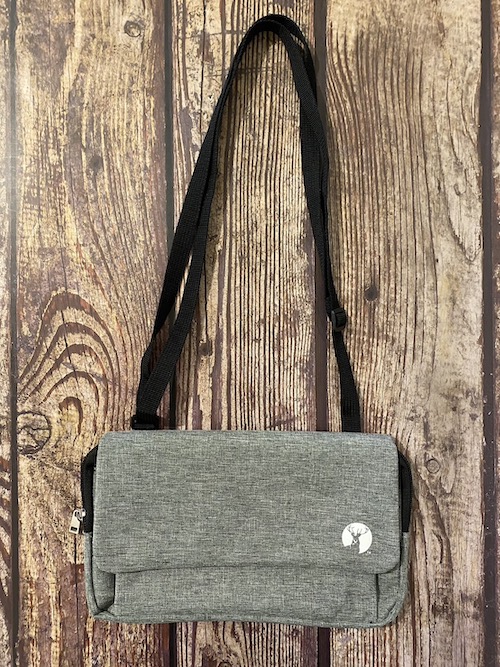シンプルなグレーのボディに、アウトドアブランド「キャプテンスタッグ」の鹿ロゴがワンポイントになっています。サイズは(約)W24×H13.5×D1.5cmと薄型でコンパクト。体にフィットするデザインなので、コートの上からはもちろん、内側に着用してもOK。