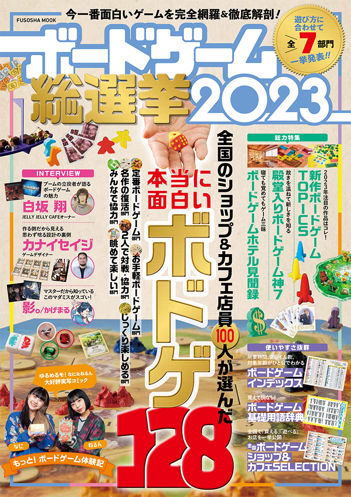 『ボードゲーム総選挙2023』(扶桑社)では、ボードゲームショップ&カフェのスタッフ100人が選んだ「本当に面白いボードゲーム」128作品を紹介している。