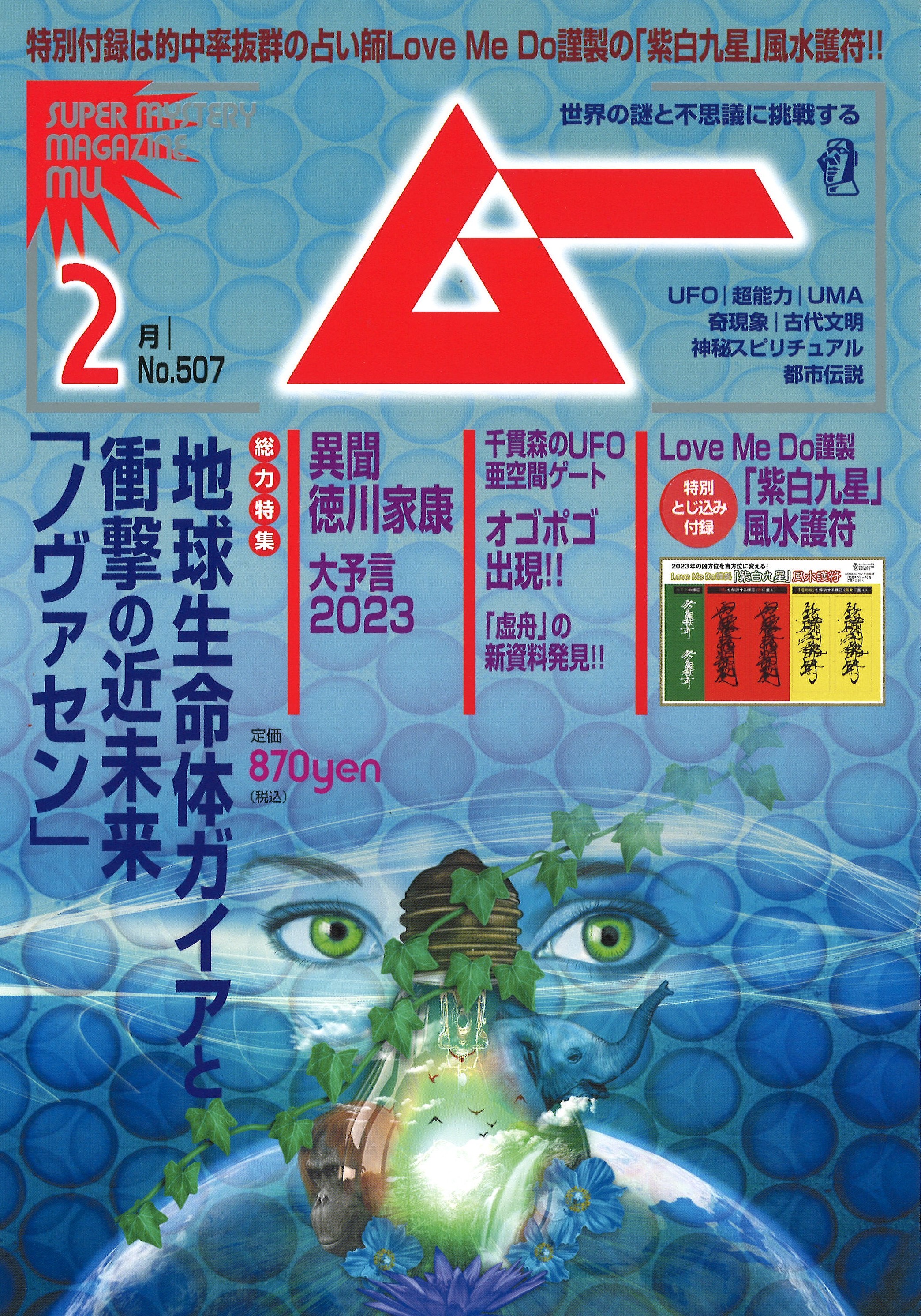 2色刷り特集 異聞 徳川家康/水面に浮かぶオゴポゴの顔の撮影に成功!!/十和田湖のキリスト像と洞窟「御室」の謎/実用スペシャル 「紫白九星」風水2023/特別付録 「紫白九星」風水護符/元科学技術長官「江田五月」のUFO遭遇事件/福島の千貫森はUFOの亜空間ゲートか!?/怪異をもたらす幻獣ミイラ ほか
