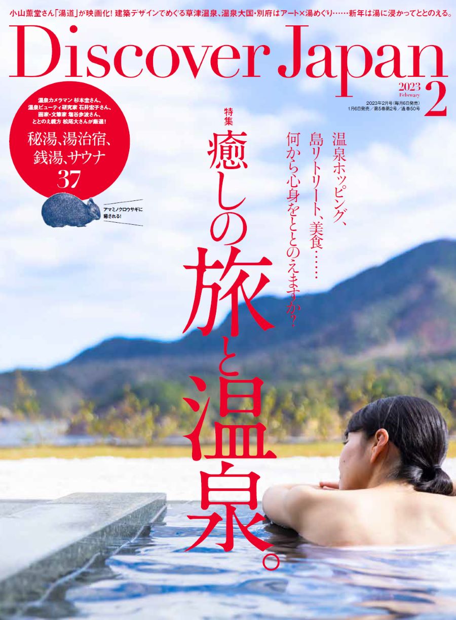 2023年1月6日発売の『Discover Japan』2023年2月号では、「癒しの旅と温泉。」を特集している。