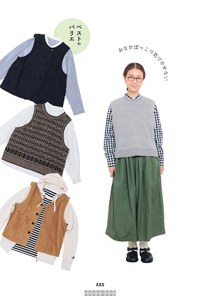 トップスのボトムスインができない(理由は...お腹ポッコリ)という佐藤さんは、ベストを愛用している。体温調節ができ、軽くて、こなれ感が出せる。そんなベストのいちばんのポイントは、体型をカバーできること。