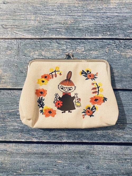 真ん中にプリントされたリトルミイを囲むお花の刺繍がおしゃれで繊細。がま口仕様でガバッと開くので、アイテムを取り出しやすいのもポイントです。