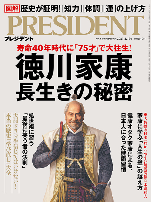 2023年1月27日発売の「プレジデント」(2023年2月17日号)は、「徳川家康 長生きの秘密」と題した特集を組んでいる。健康オタクだった家康が、平均寿命40歳の時代に、なぜ75歳まで長生きできたか、その秘密を探っている。