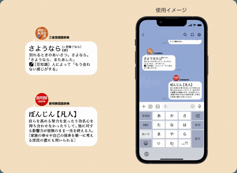 デザインは、トーク画面から浮き過ぎない、シンプルなメッセージ型の吹き出し型。また、ことばの持つ様々な側面に触れられるように、日常的によく使われる表現には豆知識を掲載。それぞれの辞書の特徴を楽しめるようになっている。