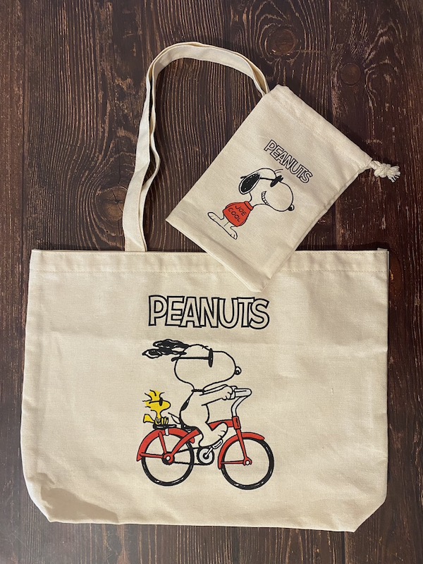 可愛いミニ巾着もセットでついてきます。トートをしまっても良し、単品使いしても良し、キュートなスヌーピーが元気をくれます。