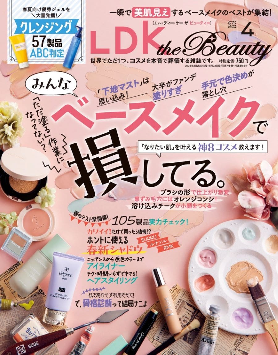 『LDK the Beauty』4月号(晋遊舎)では、ベースメイクを総力特集。「そのベースメイク、損してます!」と題して、美肌になれるトーンアップ下地やコンシーラー、チークなどを徹底検証していく。下地やチークなどを普段なんとなく選んでいる方は、「損」してるかも...?