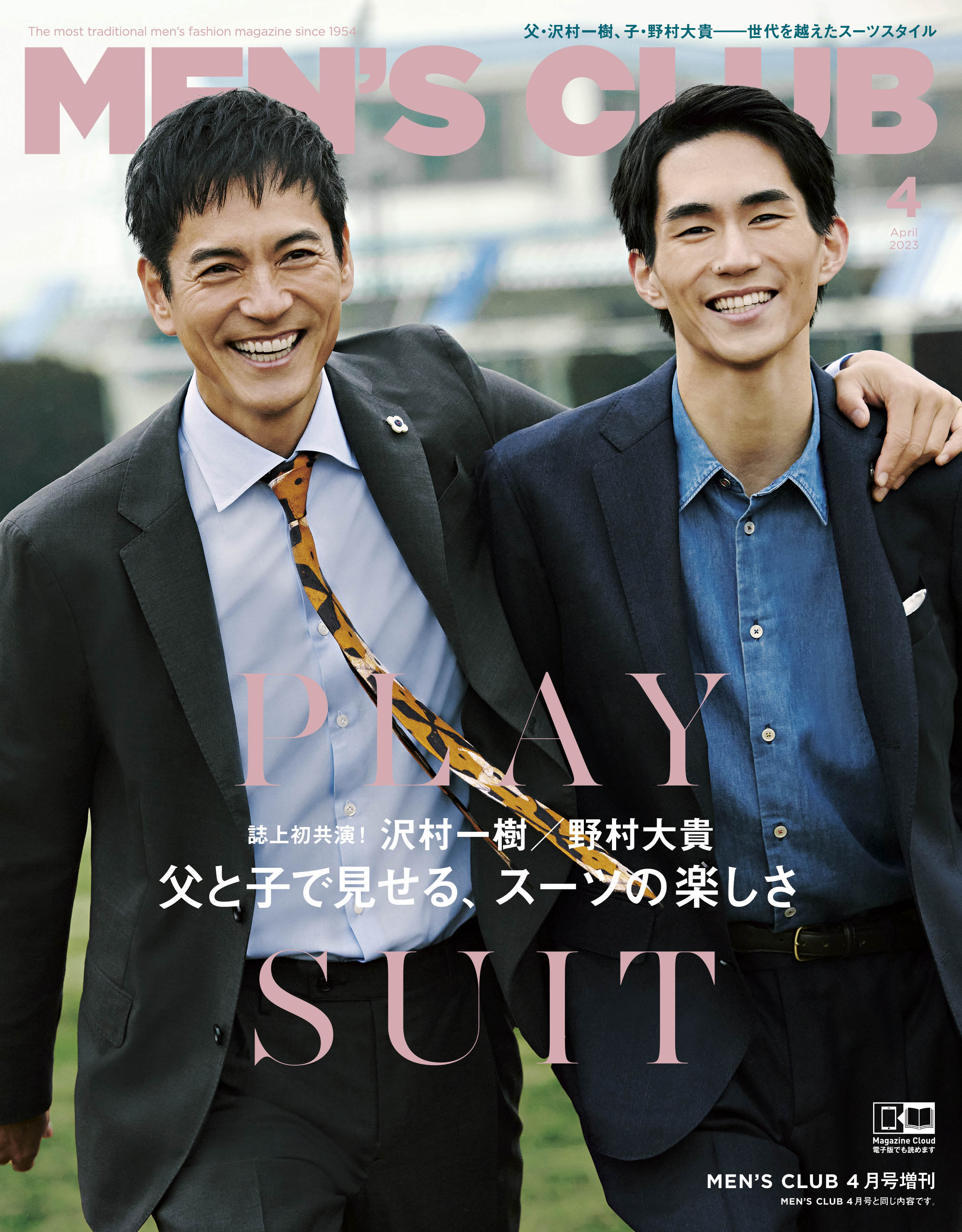 沢村一樹さんは、1990年代『メンズクラブ』の専属モデルとしてキャリアをスタートさせた。そんな父の背中を追うように、モデルとして活躍する野村大貴さん。遊び心あふれるスーツ姿で交わす、父と子のフォトセッションは必見だ。