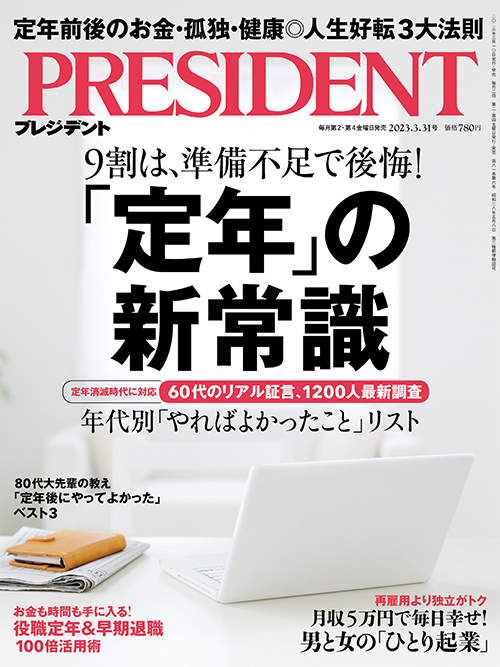 2023年3月10日発売の「プレジデント」(2023年3月31日号)は、「『定年』の新常識」と題した特集を組んでいる。9割の人が、準備不足で後悔しているという。定年前後のお金、孤独、健康対策をまとめている。