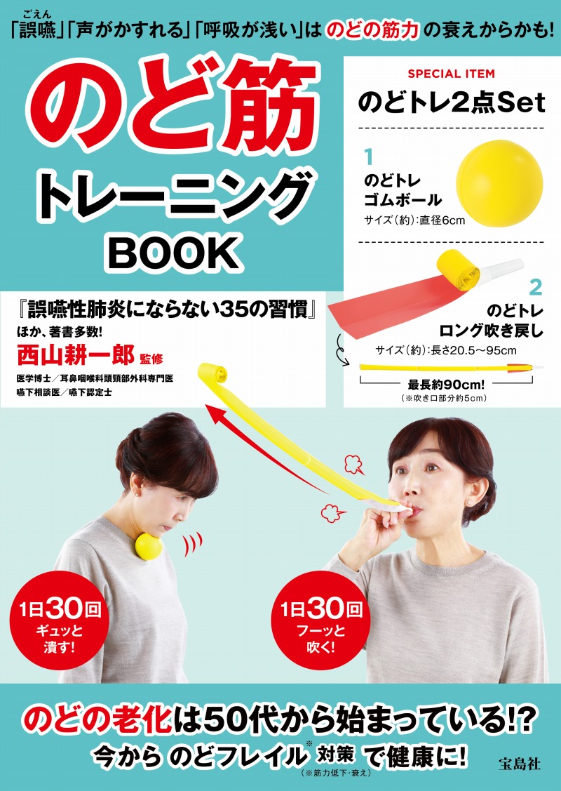 本書では、のどの筋肉の役割やトレーニング方法を紹介。『誤嚥性肺炎にならない35の習慣』など多数の著書を手掛ける西山さんの監修のもと、本誌オリジナルのゴムボールと吹き戻しで、すぐに「のど筋トレーニング」をはじめることができる。