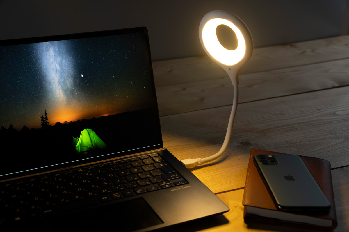 暗く映りがちなオンライン会議での表情には、パッと明るく温白色の光が向いている。照明が消えた機内の読書灯には、文字が読みやすい昼白色のクリアな光がオススメ。