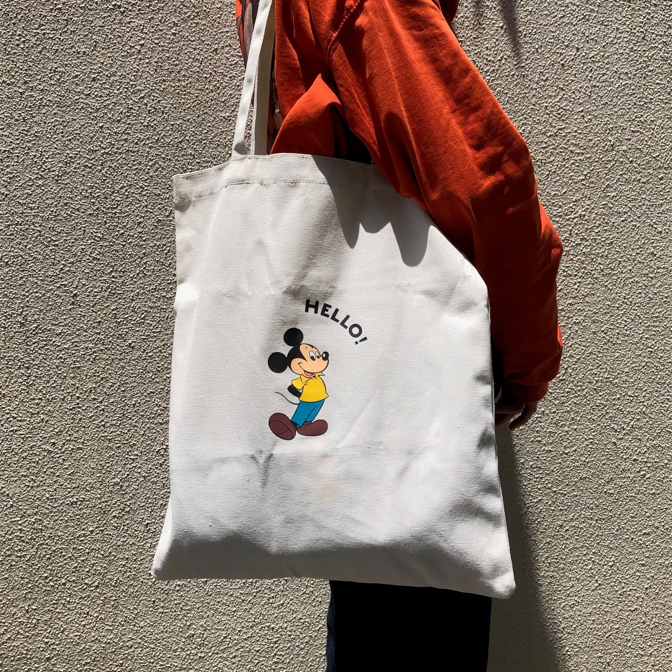 トートバッグは、ベーシックなキャンバス生地の真ん中に、「HELLO!」と上機嫌なミッキーマウスがプリントされています。黄色の半袖シャツにジーンズという、カジュアルなスタイルがおしゃれ。