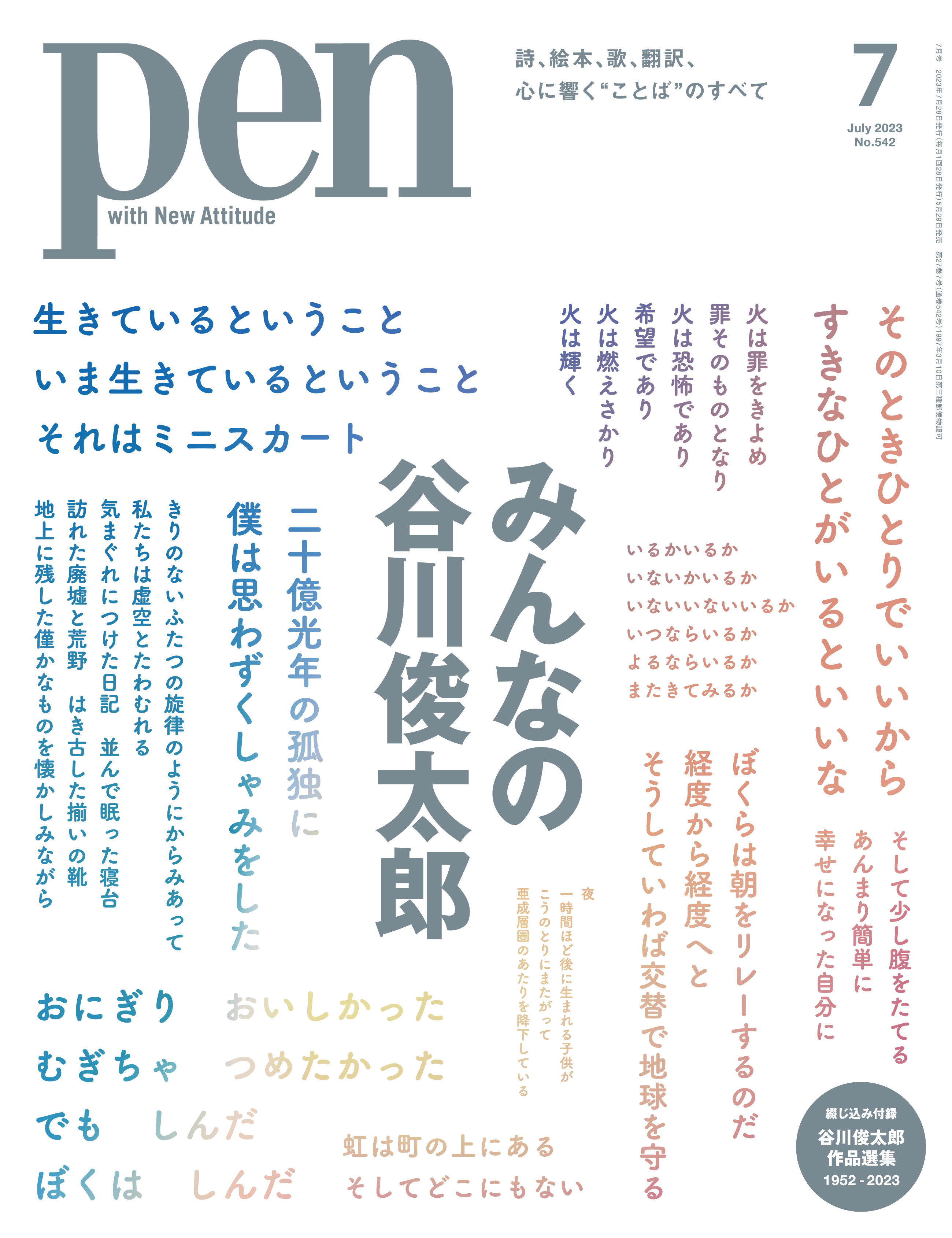 国語の教科書などで、きっと誰もが触れたことのある詩人・谷川俊太郎さんの言葉。詩をはじめ、絵本、翻訳、校歌まで、老若男女の暮らしの中に息づいている。「Pen」2023年7月号(CCCメディアハウス)は、「みんなの谷川俊太郎」と題し、いつの時代も変わらず愛されるその魅力を特集した。