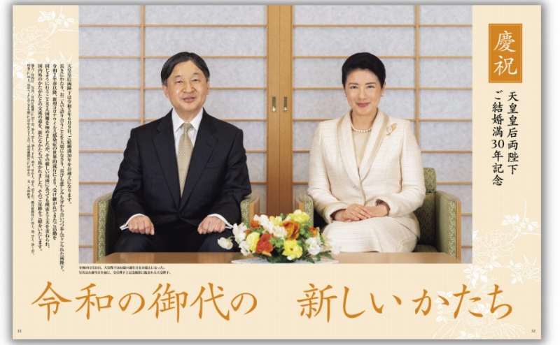 2023年6月1日に発売された『家庭画報 7⽉号』(世界⽂化社)の巻頭特集は「令和の御代の新しいかたち」。天皇皇后両陛下のご結婚満30年を記念し、ご一家の足跡をたどっている。