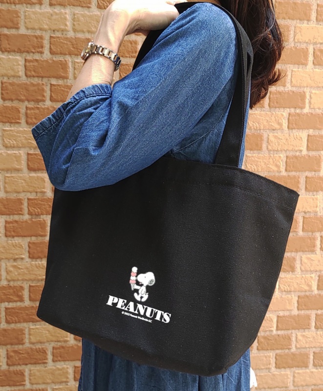 黒のトートは高さ23.5×幅35.5×マチ11cmで、長めの持ち手がついています。程よい容量で、本や雑貨、コンビニでの買い物に最適。13インチのPCも入ります。