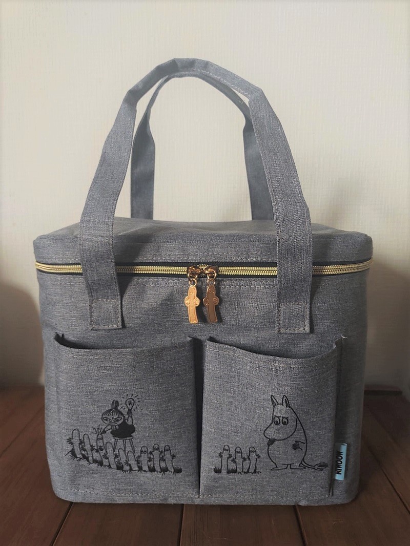 落ち着いたグレーの生地で、ポケットにはムーミンやリトルミイの遊び心があるイラストが描かれています。サイズは幅28×24×マチ15cmで、500mlのペットボトルや350ml缶なら、ともに8本収納できます。