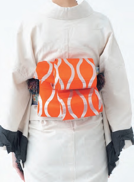 途中で帯を折り上げているため、まるでいくつもの帯が重なっているように見え、目を引く仕上がりに。帯の柄を工夫すれば、より個性的な印象になりそうだ。