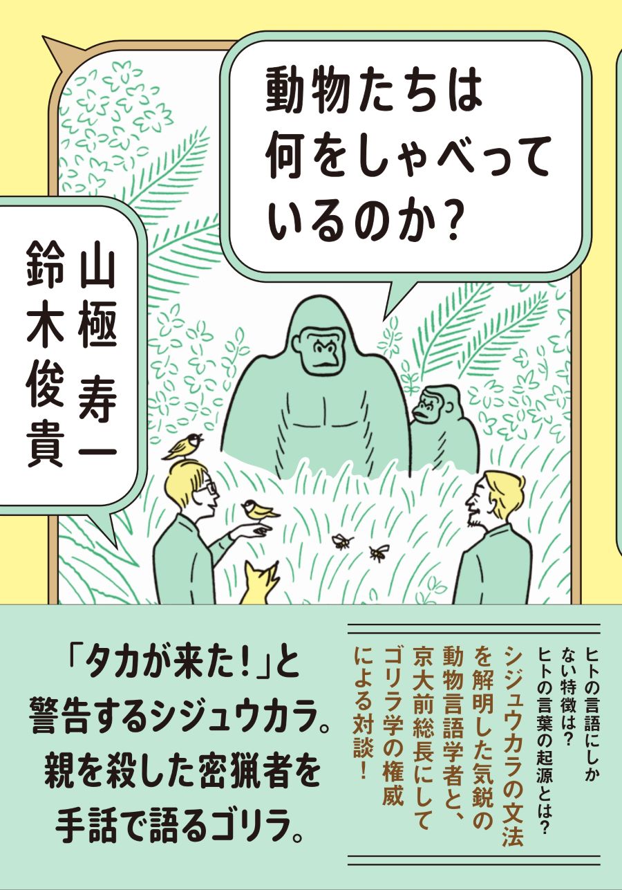 本書は、ゴリラになりたくて群れの中で過ごした霊長類学者にして京大前総長の山極寿一さんと、シジュウカラの言葉を解明した気鋭の研究者・鈴木俊貴さんによる最近の知見をもとにした対談本だ。