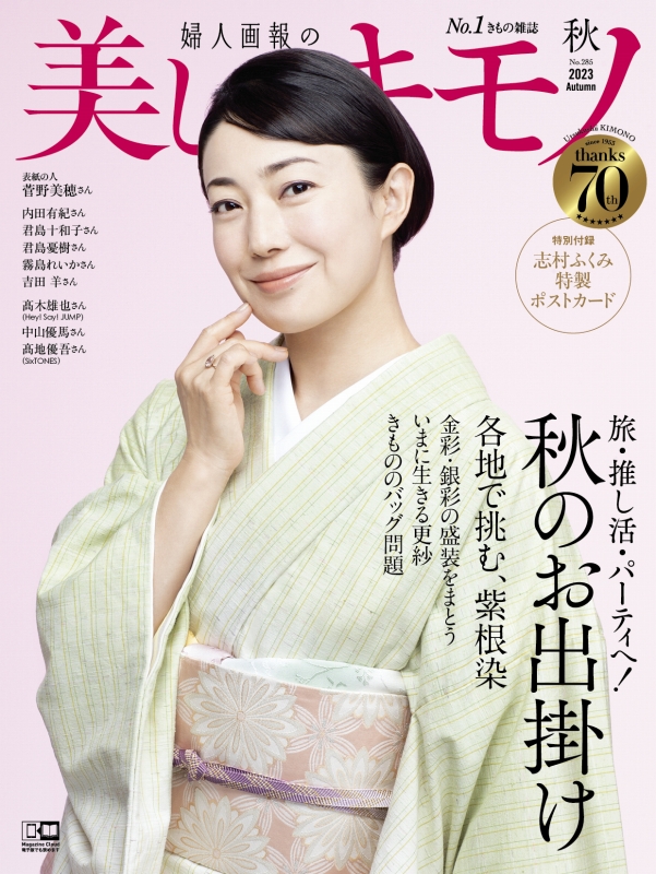 俳優の菅野美穂さんが表紙を飾る『美しいキモノ』2023年秋号(ハースト婦人画報社)。菅野さんがまとっているのは、人間国宝・志村ふくみさんが特別に制作した、虹のような色彩の紬織訪問着だ。