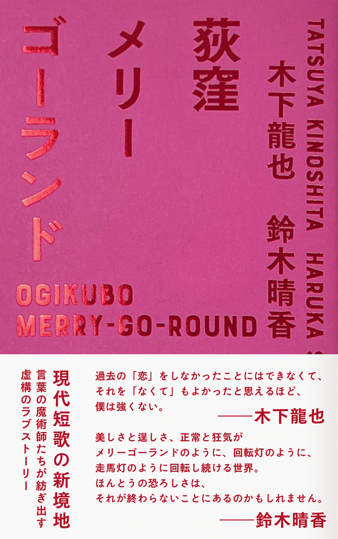 現代短歌界を担う歌人・木下龍也さんと鈴木晴香さんが、新たな試みに挑んだ。『荻窪メリーゴーランド』(太田出版)は、2人が架空の男女を演じ、短歌だけで紡いでいくラブストーリー。2022年7月から2023年6月にかけてのWebマガジン「OHTABOOKSTAND」での連載が書籍化され、2023年8月29日に発売となった。