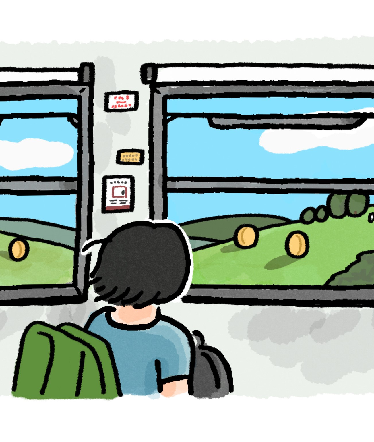 駅を過ぎるたびに車内から乗客が減っていく。窓の外に建物が消え、日差しを浴びて輝く薄緑の丘陵が広がり始めると最寄りの駅が近づく合図だ。滑らかなカーブを描く丘の斜面には、冬のために刈り取られた牧草のロールがゴロリゴロリと並んでいる。そのロールが草原に落とす影は、駆け回る子供たちのように不規則で楽しげだ。白い牛の群れが木陰に集まり、それぞれの尻尾を揺らす。