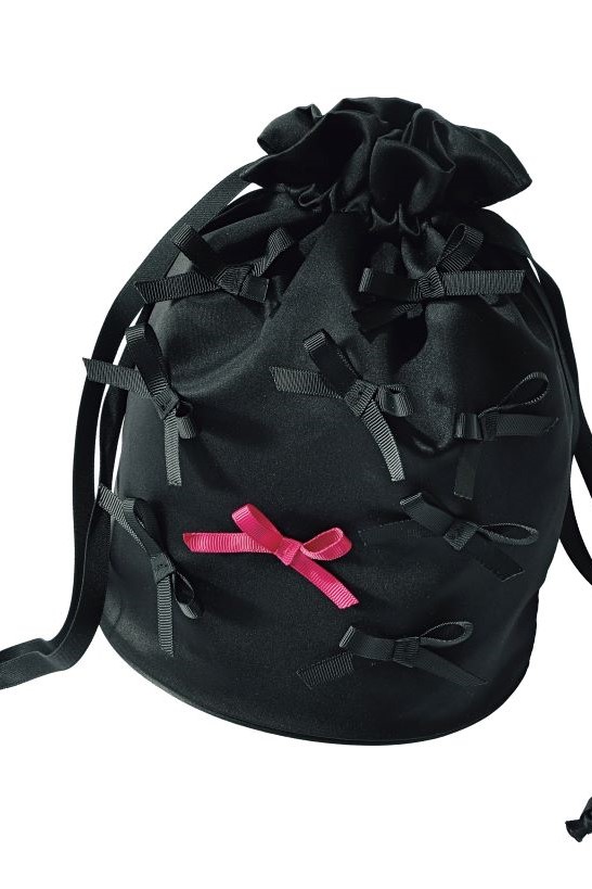 どんなファッションにも合わせやすい黒ベースの巾着バッグ。シックながら見栄えするリボンと自立するフォルムがこだわりのポイントです。