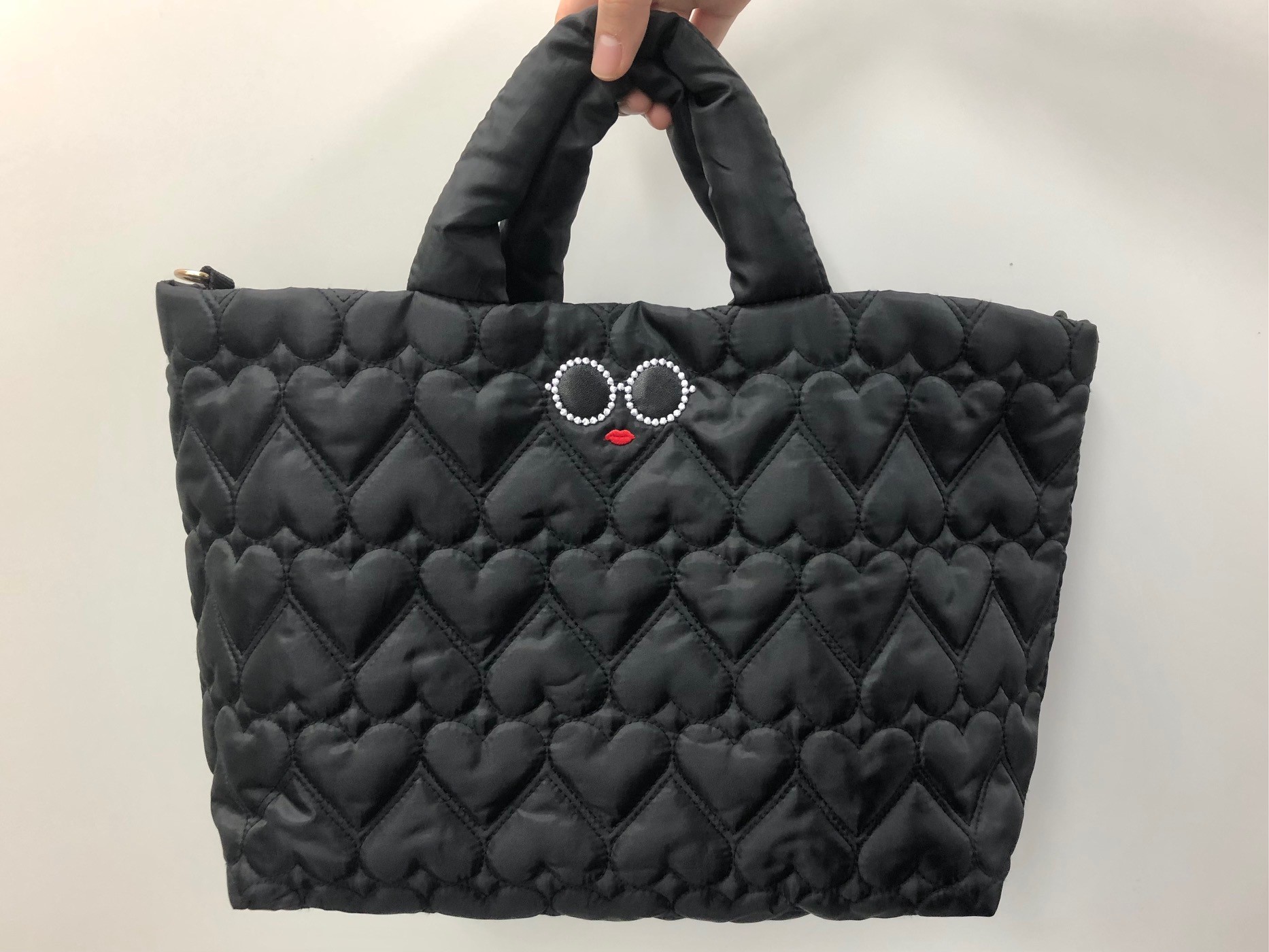 今年トレンドのキルティングバッグ。ハート形のキルティングに、アジョリーのアイコン"パールサングラスちゃん"の刺繍が可愛い! 気分が上がる、個性的なデザインです。