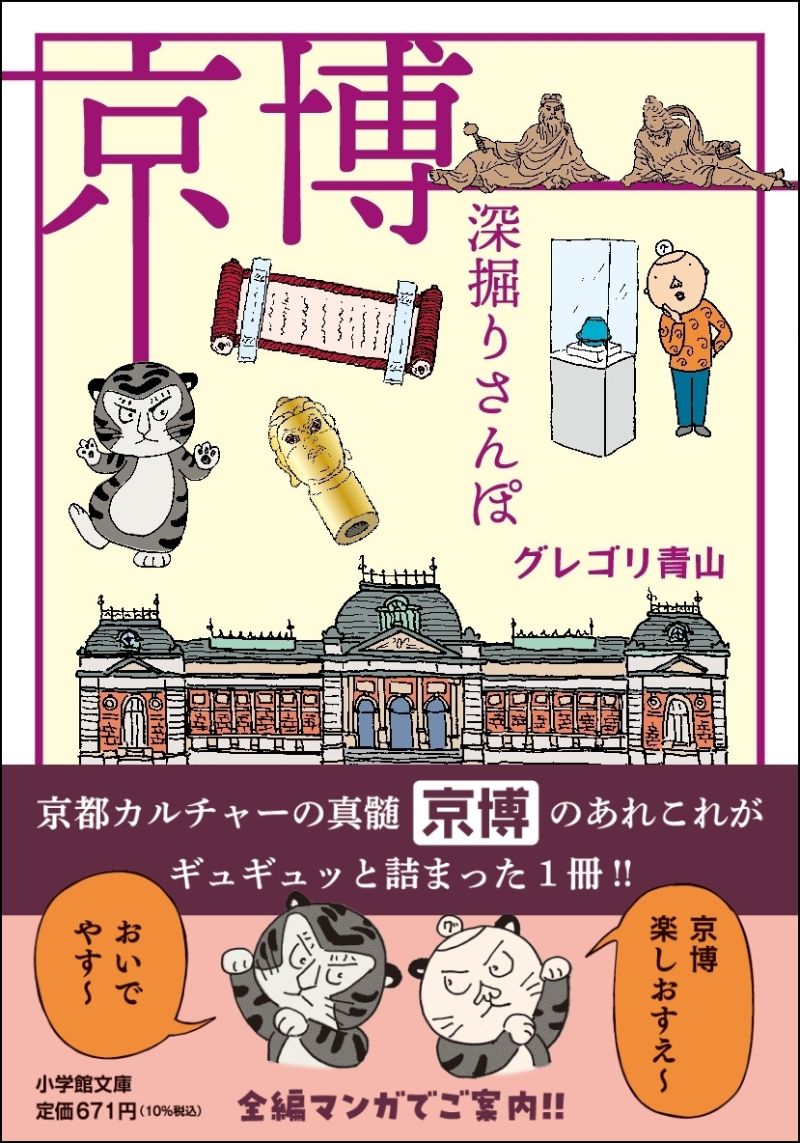 本書は、地元では親しみを込めて「きょうはく(京博)」と呼ばれる京都国立博物館のさまざまな側面を、京都府生まれで、新撰組で有名な壬生(みぶ)育ちで、『京都「トカイナカ」暮らし』『グレさんぽ 猫とかキモノとか京都とか』『京都深堀りさんぽ』など、京都が題材の著書を多数もつ漫画家・グレゴリさんのマンガで紹介するもの。「大人の社会科見学」を楽しめる1冊だ。
