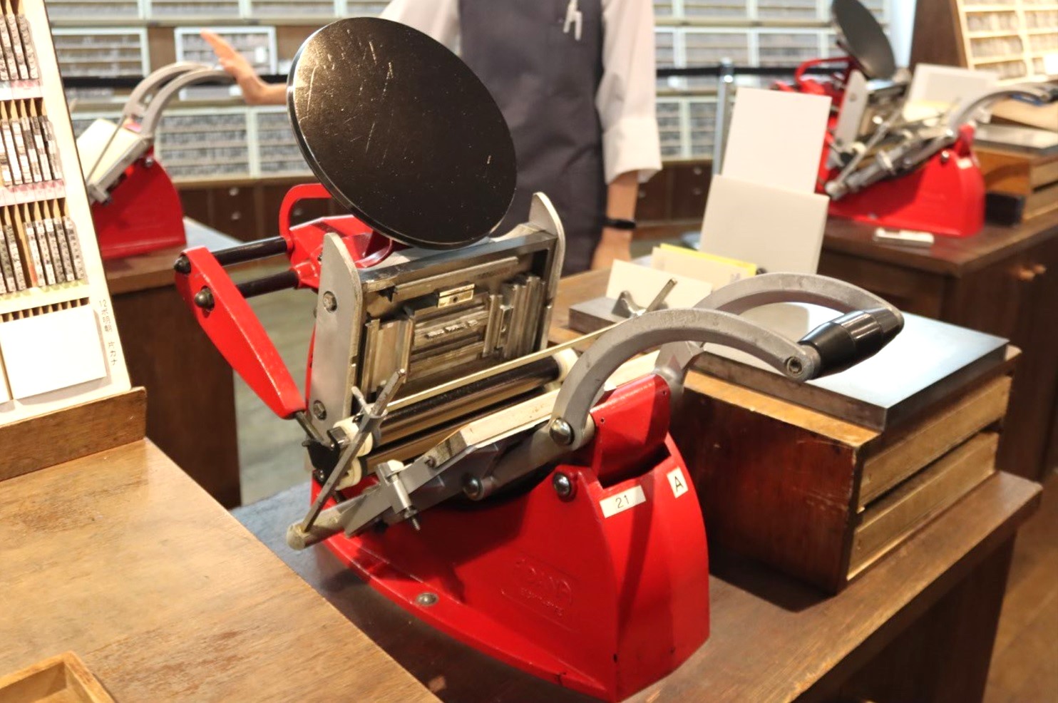 では、いよいよ印刷工房へ。体験させてもらったのはイギリス生まれの「アダナ印刷機」だ。家庭用として、グリーティングカードや招待状を印刷するのに使われている活版印刷機だ。
