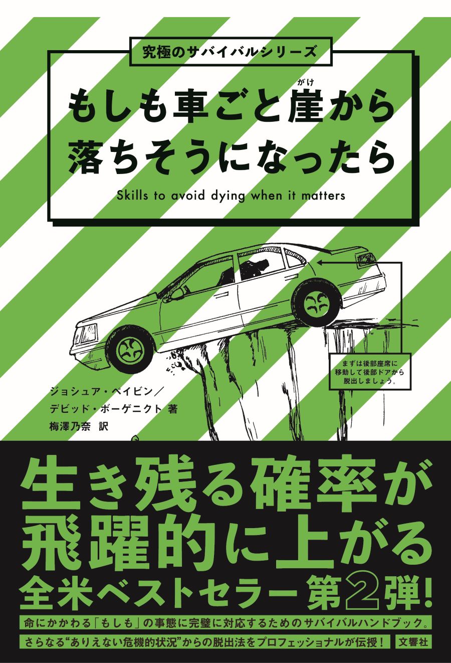 ありえない(でも絶対ないとは言い切れない)状況で、パニックにならず、生き残るための行動を教えてくれるのが本書、『もしも車ごと崖から落ちそうになったら』(文響社)だ。『もしもワニに襲われたら』の続編で、今回もさまざまな状況を想定し、危機回避術を真剣に考えていく。