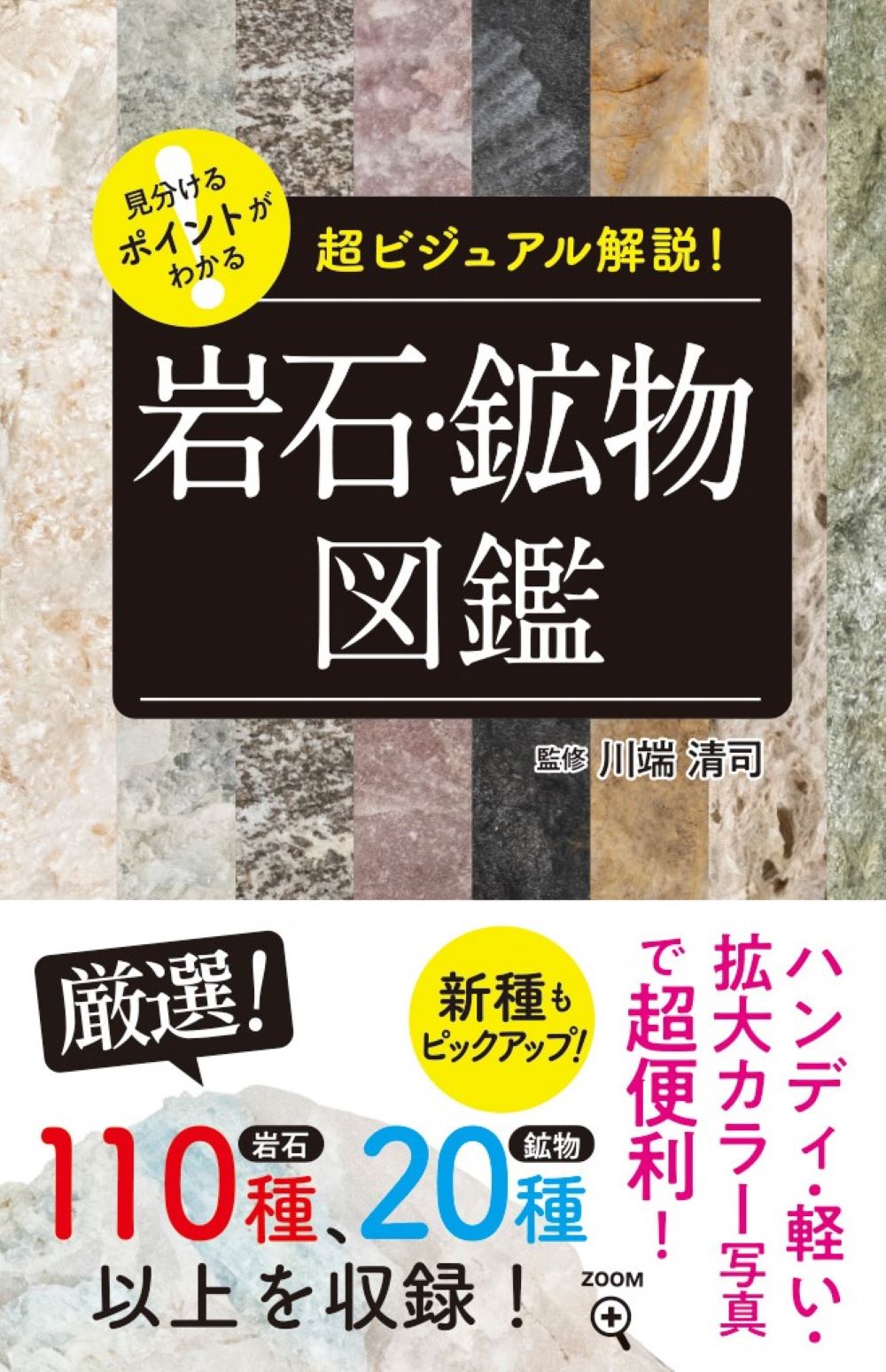 本書は持ち歩きやすいB6サイズ。厳選した日本各地の岩石110種と、それを構成する鉱物20種を紹介している。